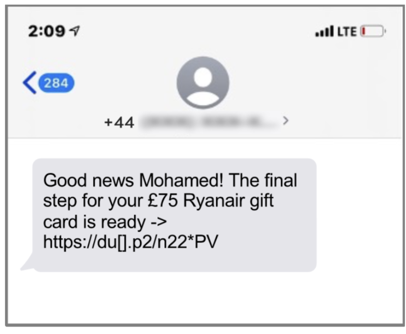 Questo è un esempio di smishing registrato in UK, nel quale un messaggio truffaldino in tema viaggi, che simula Ryanair come mittente, informa un cliente della possibilità di attivare un buono regalo, spingendolo a cliccare su un link non legittimo.